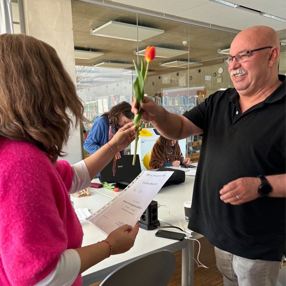 Im Mittelpunkt des Moduls standen praktische Themen wie Anträge und Formulare – etwa für An- und Abmeldungen beim Bürgeramt, Kindergeld, Bürgergeld oder Kitagutscheine. Projektleiterin Mila Zaharieva-Schmolke überreichte die Zertifikate und sprach den Teilnehmer*innen ihre herzliche Anerkennung aus.